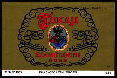 Bortípus: szamorodni; Termelő neve: Tokajhegyaljai Állami Gazdasági Borkombinát; Termelő címe: Sátoraljaújhely; színes címke