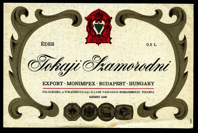 Bortípus: szamorodni; Termelő neve: Tokajhegyaljai Állami Gazdasági Borkombinát; Termelő címe: Tolcsva; színes címke