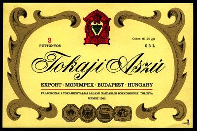 Bortípus: aszú; Termelő neve: Tokajhegyaljai Állami Gazdasági Borkombinát; Termelő címe: Tolcsva; színes címke