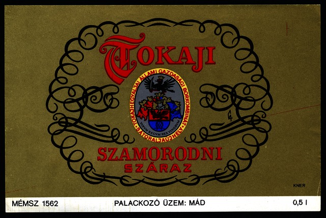 Bortípus: szamorodni; Termelő neve: Tokajhegyaljai Állami Gazdasági Borkombinát; Termelő címe: Sátoraljaújhely; színes címke