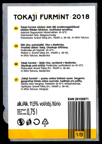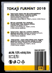 Bortípus: furmint; Termelő neve: Grand Tokaj Zrt.; Termelő címe: 3934 Tolcsva, Petőfi S. u. 36-40.; Évjárat: 2018; színes címke