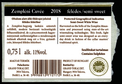 Bortípus: cuvée; Termelő neve: Grand Tokaj Zrt.; Termelő címe: 3934 Tolcsva, Petőfi S. u. 36-40.; Évjárat: 2018; színes címke