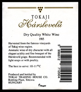 Bortípus: hárslevelű; Termelő neve: Tokaj Trading House Co.; Termelő címe: Tolcsva; Évjárat: 1995; színes címke