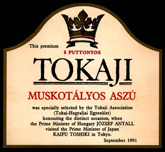 Kun, Zsanett (Digitalizáló): Antall József miniszterelnök tokiói látogatása alkalmából válogatott 1991-es tokaji muskotályos aszú boroscímkéje a Grand Tokaj Zrt.-től. (Publikálatlan) (2024)