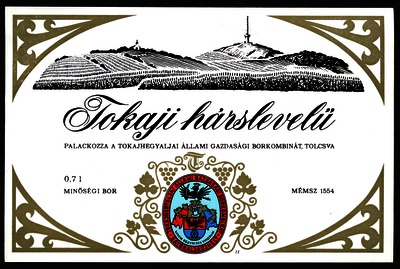 Bortípus: hárslevelű; Termelő neve: Tokajhegyaljai Állami Gazdasági Borkombinát; Termelő címe: Sátoraljaújhely; színes címke