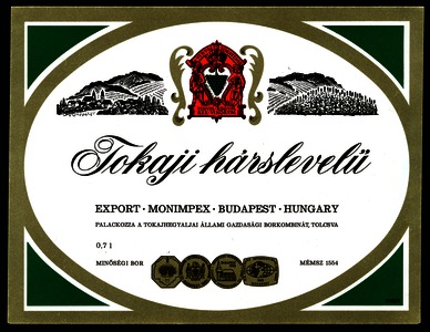 Bortípus: hárslevelű; Termelő neve: Tokajhegyaljai Állami Gazdasági Borkombinát; Termelő címe: Sátoraljaújhely; színes címke