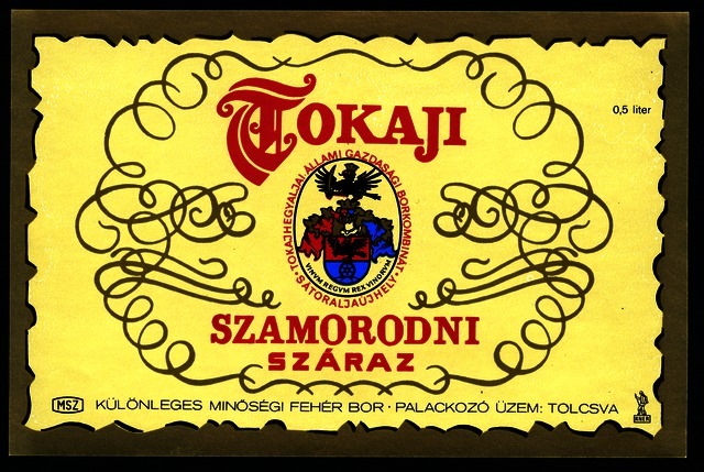 Bortípus: szamorodni; Termelő neve: Tokajhegyaljai Állami Gazdasági Borkombinát; Termelő címe: Sátoraljaújhely; színes címke