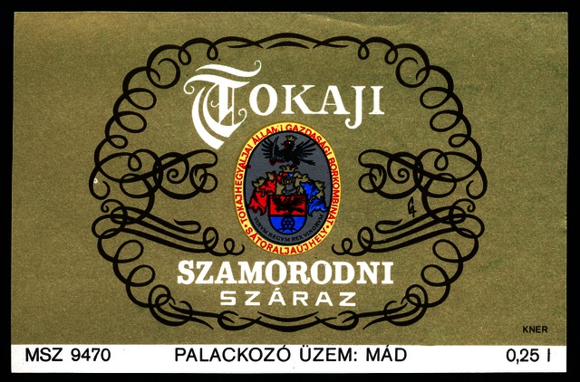 Bortípus: szamorodni; Termelő neve: Tokajhegyaljai Állami Gazdasági Borkombinát; Termelő címe: Sátoraljaújhely; színes címke