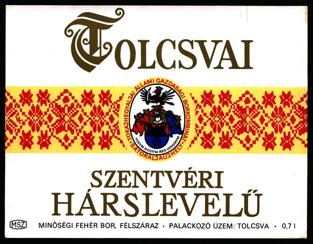 Kun, Zsanett (Digitalizáló): Tolcsvai szentvéri hársleveű boroscímke a Tokajhegyaljai Állami Gazdasági Borkombináttól. (Publikálatlan) (2024)