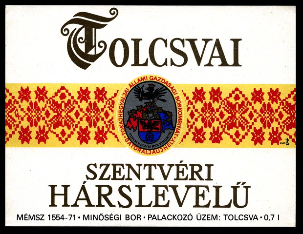 Kun, Zsanett (Digitalizáló): Tolcsvai szentvéri hárslevelű boroscímke a Tokajhegyaljai Állami Gazdasági Borkombináttól. (Publikálatlan) (2024)