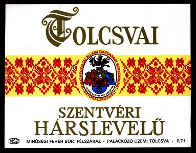 Tolcsvai szentvéri hárslevelű boroscímke a Tokajhegyaljai Állami Gazdasági Borkombináttól