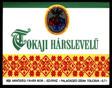 Bortípus: hárslevelű ; Termelő neve: Tokajhegyaljai Állami Gazdasági Borkombinát; Termelő címe: Sátoraljaújhely; színes címke