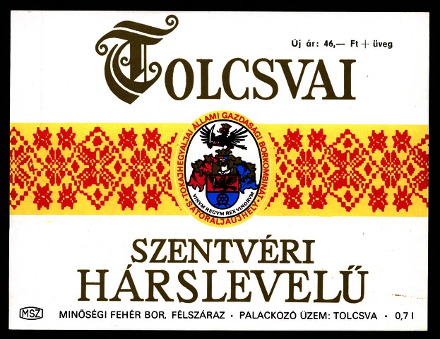 Kun, Zsanett (Digitalizáló): Tolcsvai szentvéri hárslevelű boroscímke a Tokajhegyaljai Állami Gazdasági Borkombináttól. (Publikálatlan) (2024)
