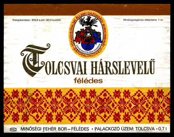Bortípus: hárslevelű ; Termelő neve: Tokajhegyaljai Állami Gazdasági Borkombinát; Termelő címe: Sátoraljaújhely; színes címke