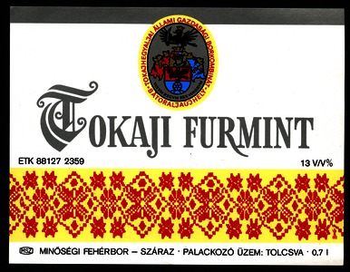Bortípus: furmint; Termelő neve: Tokajhegyaljai Állami Gazdasági Borkombinát; Termelő címe: Sátoraljaújhely; színes címke