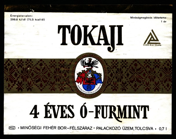 Bortípus: ó-furmint; Termelő neve: Tokajhegyaljai Állami Gazdasági Borkombinát; Termelő címe: Sátoraljaújhely; színes címke