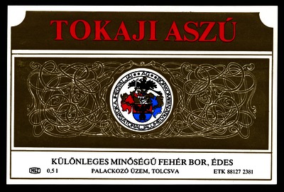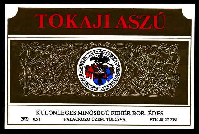 Bortípus: aszú; Termelő neve: Tokajhegyaljai ÁG Borkombinát; Termelő címe: Sátoraljaújhely; színes címke