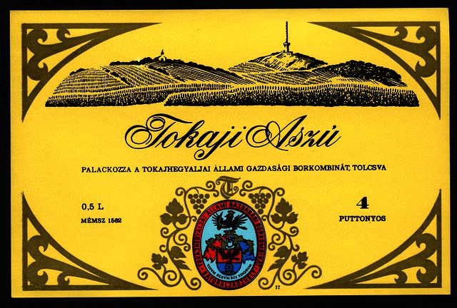 Bortípus: aszú; Termelő neve: Tokajhegyaljai Állami Gazdasági Borkombinát; Termelő címe: Sátoraljaújhely; színes címke
