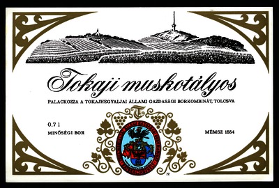 Bortípus: muskotályos; Termelő neve: Tokajhegyaljai Állami Gazdasági Borkombinát; Termelő címe: Sátoraljaújhely; színes címke