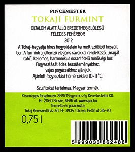 Bortípus: furmint; Termelő neve: Tokaj Kereskedőház Rt.; Termelő címe: 3934 Tolcsva, Petőfi út 36-40.; Évjárat: 2012; színes címke