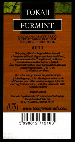 Bortípus: furmint; Termelő neve: Tokaj Kereskedőház Rt.; Termelő címe: 3934 Tolcsva, Petőfi út 36-40.; Évjárat: 2012; színes címke