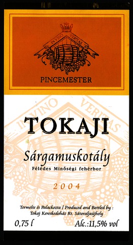 Bortípus: sárga muskotály; Termelő neve: Tokaj Kereskedőház Rt.; Termelő címe: Sátoraljaújhely; Évjárat: 2004; színes címke