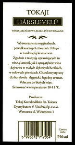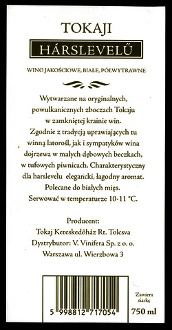 Bortípus: hárslevelű; Termelő neve: Tokaj Kereskedőház Rt.; Termelő címe: Tolcsva; színes címke