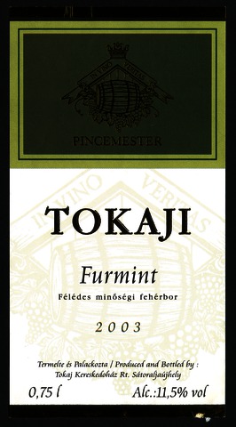 Bortípus: furmint; Termelő neve: Tokaj Kereskedőház Rt.; Termelő címe: Sátoraljaújhely; Évjárat: 2003; színes címke
