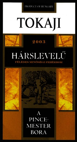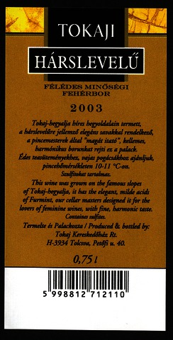 Bortípus: furmint; Termelő neve: Tokaj Kereskedőház Rt.; Termelő címe: 3934 Tolcsva, Petőfi S. u. 40.; Évjárat: 2003; színes címke