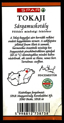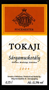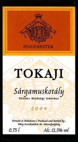 Bortípus: sárgamuskotály; Termelő neve: Tokaj Kereskedőház Rt.; Termelő címe: Sátoraljaújhely; Évjárat: 2004; színes címke
