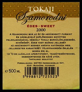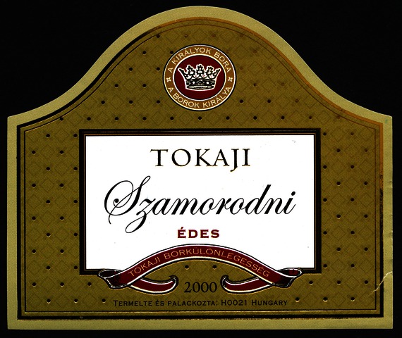 Bortípus: szamorodni; Termelő neve: H0021 Hungary; Évjárat: 2000; színes címke