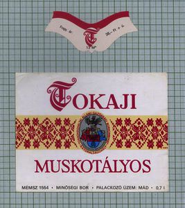 Bortípus: muskotály; Termelő neve: Tokajhegyaljai Államigazdasági Borkombinát ; Termelő címe: Sátoraljaújhely, Mártírok útja 17.; Évjárat: 1971 és 1974 között; színes címke