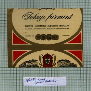 Bortípus: furmint; Termelő neve: Tokajhegyaljai Államigazdasági Borkombinát ; Termelő címe: Sátoraljaújhely, Mártírok útja 17.; Évjárat: 1970-es évek közepe; színes nyomdahibás címke