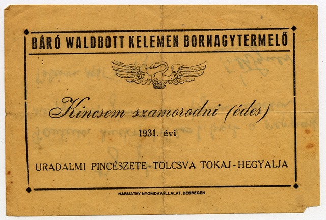 Kun, Zsanett (Digitalizáló): 1924-es 4 puttonyos tokaji aszú boroscímke Báró Waldbott Kelemen Bornagytermelőtől. (Publikálatlan) (2024)