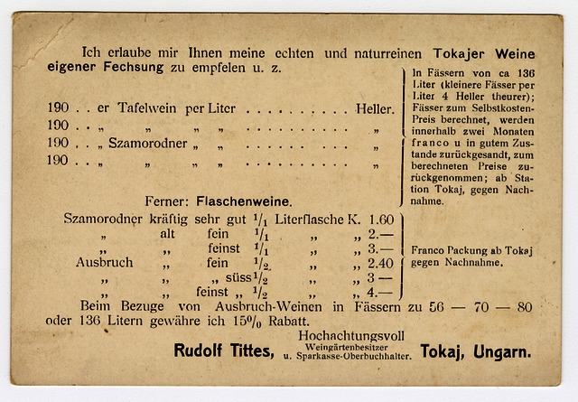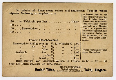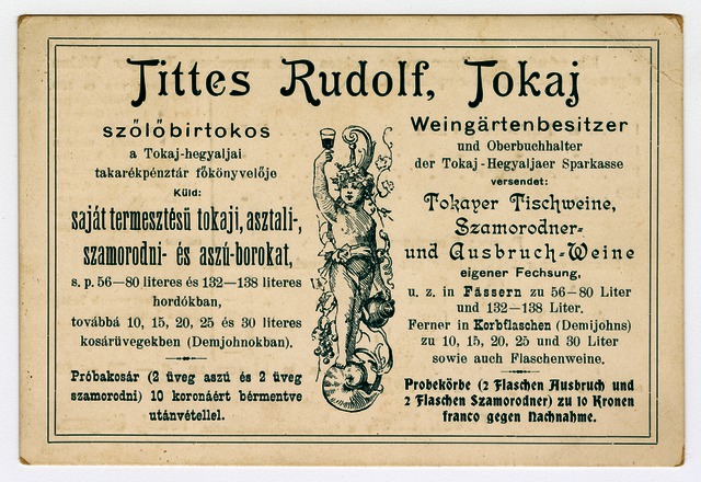 Kun, Zsanett (Digitalizáló): Tokaji borok reklámcédulája Tittes Rudolf szőlőbirtokostól. (Publikálatlan) (2024)