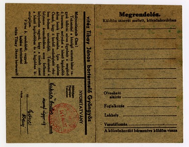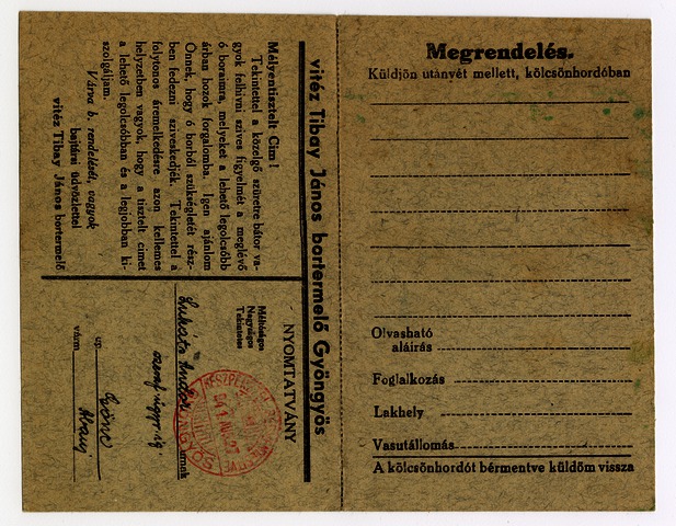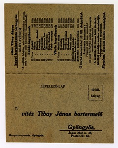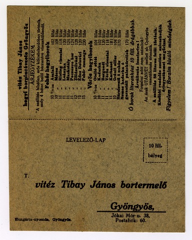 Kun, Zsanett (Digitalizáló): Vitéz Tibay János bortermelő árjegyzéke és megrendelője levelezőlapon. (Publikálatlan) (2024)