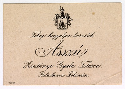 Kun, Zsanett (Digitalizáló): Tokaji aszú boroscímke Zsedényi Gyulától. (Publikálatlan) (2024)