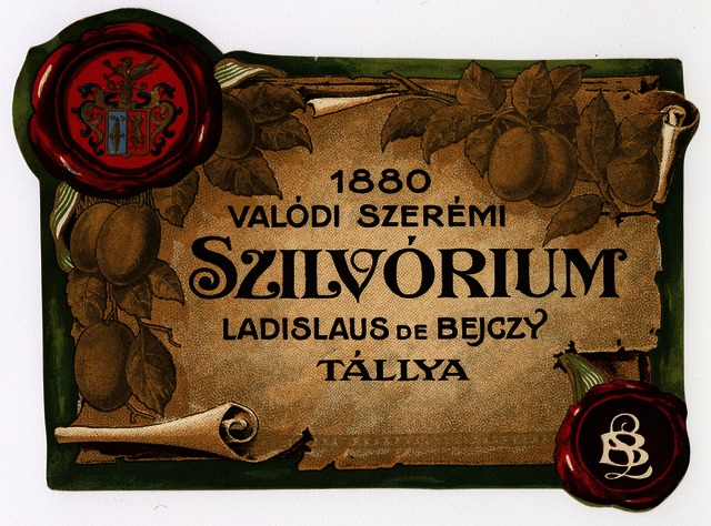 Italtípus: szilvóriuim; Termelő neve: Ladislaus de Bejczy; Termelő címe: Tállya; Évjárat: 1880; színes címke