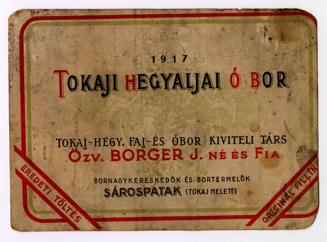 Bortípus: óbor; Termelő neve: Tokaj-hegy. Faj- és Óbor Kiviteli Társ. Özv. Borger J.-né és Fia; Termelő címe: Sárospatak; Évjárat: 1917; színes címke