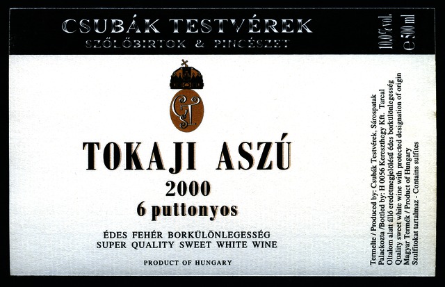 Bortípus: aszú; Termelő neve: Csubák Testvérek; Termelő címe: Sárospatak; Évjárat: 2000; színes címke