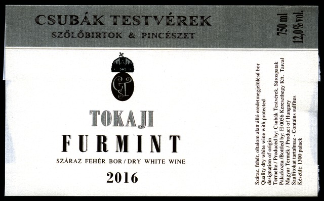 Bortípus: furmint; Termelő neve: Csubák Testvérek; Termelő címe: Sárospatak; Évjárat: 2016; színes címke