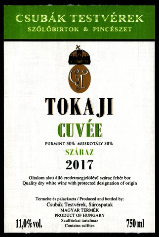 Bortípus: cuvée; Termelő neve: Csubák Testvérek; Termelő címe: Sárospatak; Évjárat: 2017; színes címke