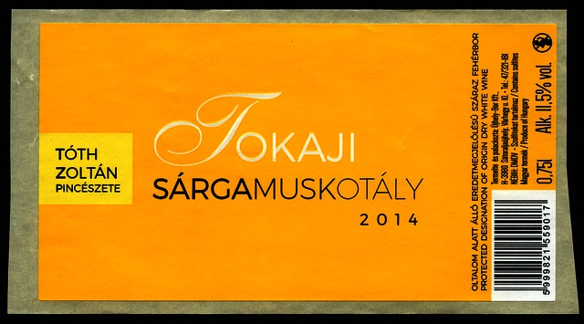 Kun, Zsanett (Digitalizáló): 2014-es tokaji sárga muskotály boroscímke Tóth Zoltán Pincészetétől. (Publikálatlan) (2024)