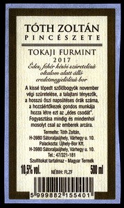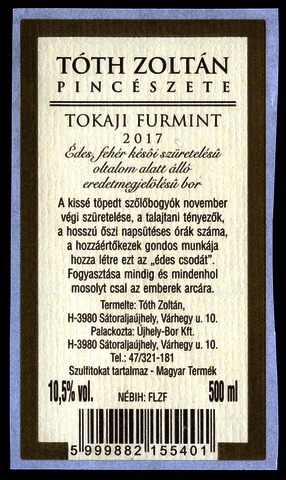Bortípus: furmint; Termelő neve: Tóth Zoltán; Termelő címe: 3980 Sátoraljaújhely, Várhegy u. 10.; Évjárat: 2017; színes címke