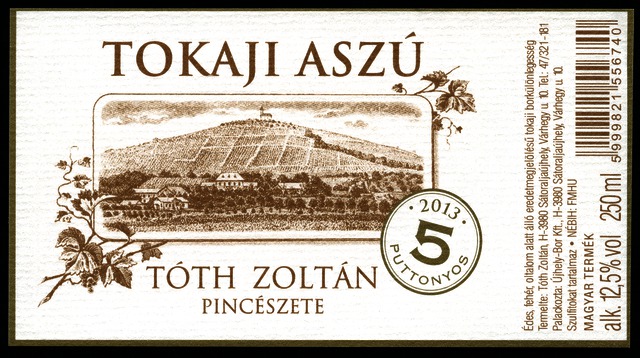 Bortípus: aszú; Termelő neve: Tóth Zoltán; Termelő címe: 3980 Sátoraljaújhely, Várhegy u. 10.; Évjárat: 2013; színes címke
