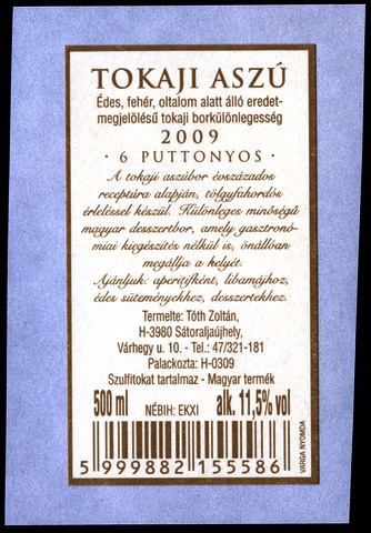 Bortípus: aszú; Termelő neve: Tóth Zoltán; Termelő címe: 3980 Sátoraljaújhely, Várhegy u. 10.; Évjárat: 2009; színes címke