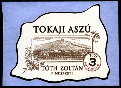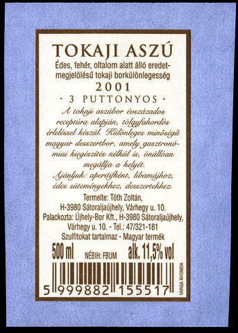 Bortípus: aszú; Termelő neve: Tóth Zoltán; Termelő címe: 3980 Sátoraljaújhely, Várhegy u. 10.; Évjárat: 2001; színes címke