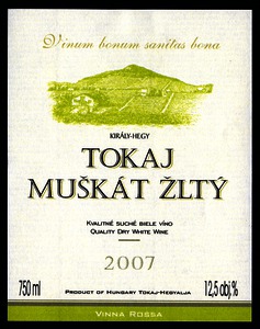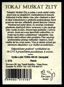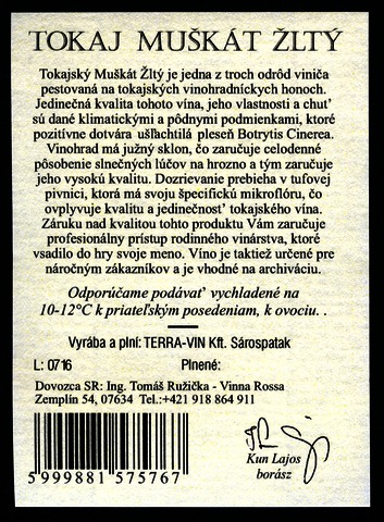 Bortípus: sárga muskotály; Termelő neve: TERRA-VIN Kft.; Termelő címe: Sárospatak; Évjárat: 2007; színes címke