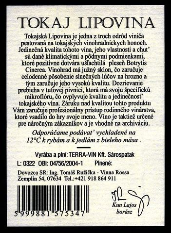 Kun, Zsanett (Digitalizáló): 2003-as Tokaj Lipovina boroscímke Kun Lajos Borászatától. (Publikálatlan) (2024)