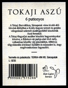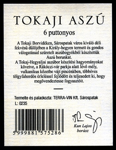 Bortípus: aszú; Termelő neve: TERRA-VIN Kft.; Termelő címe: Sárospatak; Évjárat: 2007; színes címke